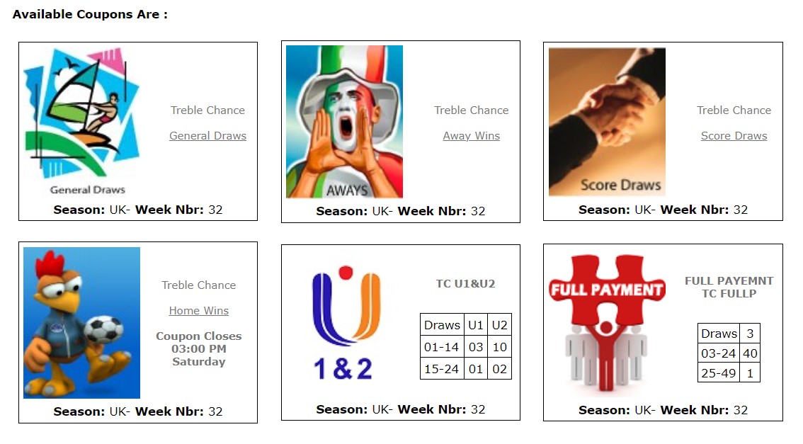 On the top right side of the web page click on STAKE, and the available coupon page will come up. There are 5 coupons currently available :- (a) TC General Draws (b) TC Score Draws (c) TC 6 Away (d) TC 8 Home (e) 4 different fixed odd coupons |