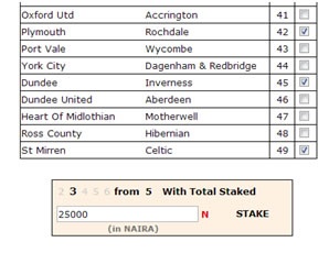 On the top left corner of the fixtures displayed, just below GAME, you will find the word UNDER. Below it you will find a box or boxes with a number by the side of a box. The number of boxes depends on the coupon type you clicked. The box you click should be determined by the minimum number of selections that will give you a winning from your overall selections. If you are selecting 5 numbers and expect 3 of them to have a winning, that is perm 3 from 5, you should click on the box by the number 3. Assuming you want to stake a coupon perming 3,4,5 from 6, then you must tick the boxes for 3,4 and 5. Take the HOME coupon for example, you can only predict a minimum of 8 selection, so you should tick the only box available, the same goes for the AWAY coupon which is an under 6 coupon. |